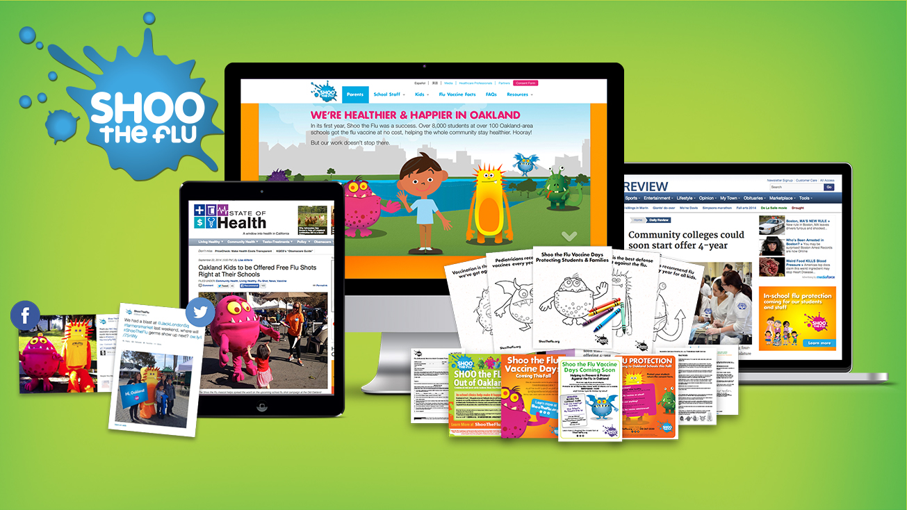 Shoo the Flu is a program started by Google founder Larry Page and his wife Lucinda. To create an informative yet family friendly brand, RPG created a series of characters along with videos featuring doctors and take-home kits to help children sign up for flu shots.