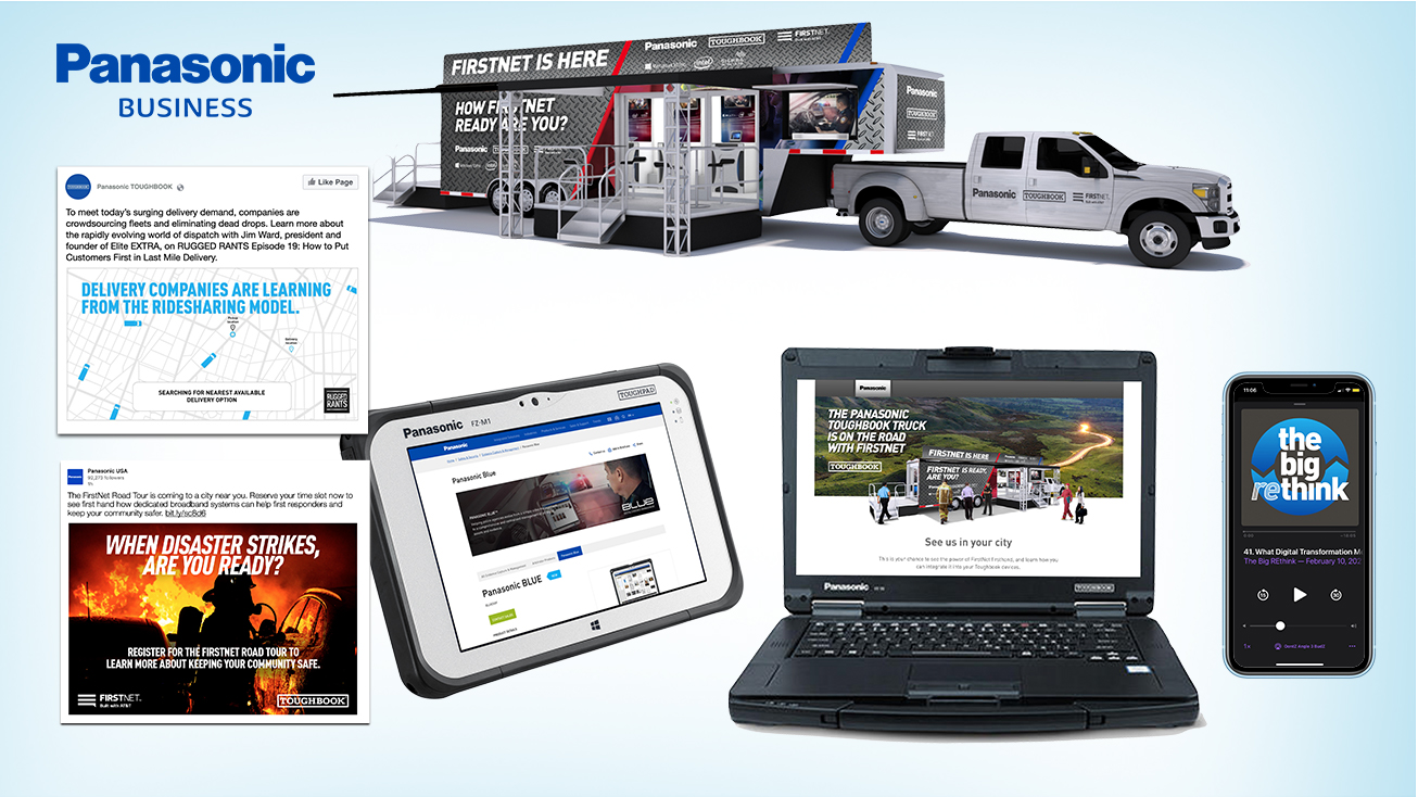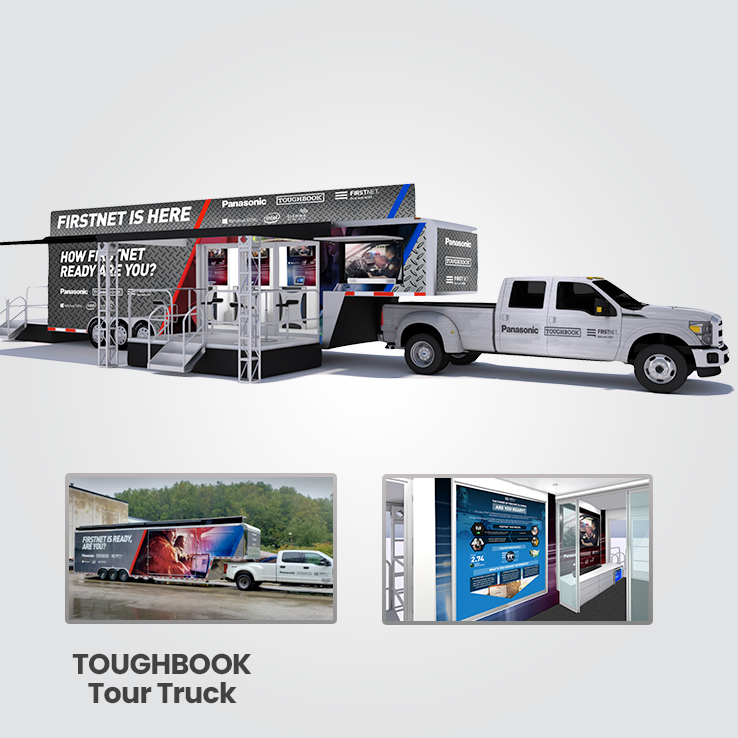 For our work related to the TOUGHBOOK brand, we had to make sure the designs looked rugged yet tech savvy and appealed to the audience: first responders and emergency workers. For the truck we integrated a grip metal texture into the exterior designs. For products that focus more on business technology, we used aspects of Panasonic's existing brand and updated it to a cleaner, corporate look.